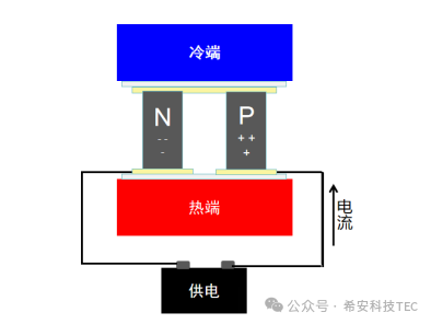 Pooljuhtjahutuse põhimõte (Peltieri efekt) : kui vool läbib p-tüüpi ja n-tüüpi pooljuhtmaterjalide kontaktpinda, siis kandjad migreeruvad ja neelavad soojust, et saavutada jahtumine (külm ots), samal ajal kui soojus eraldub teisel pool (kuum ots)